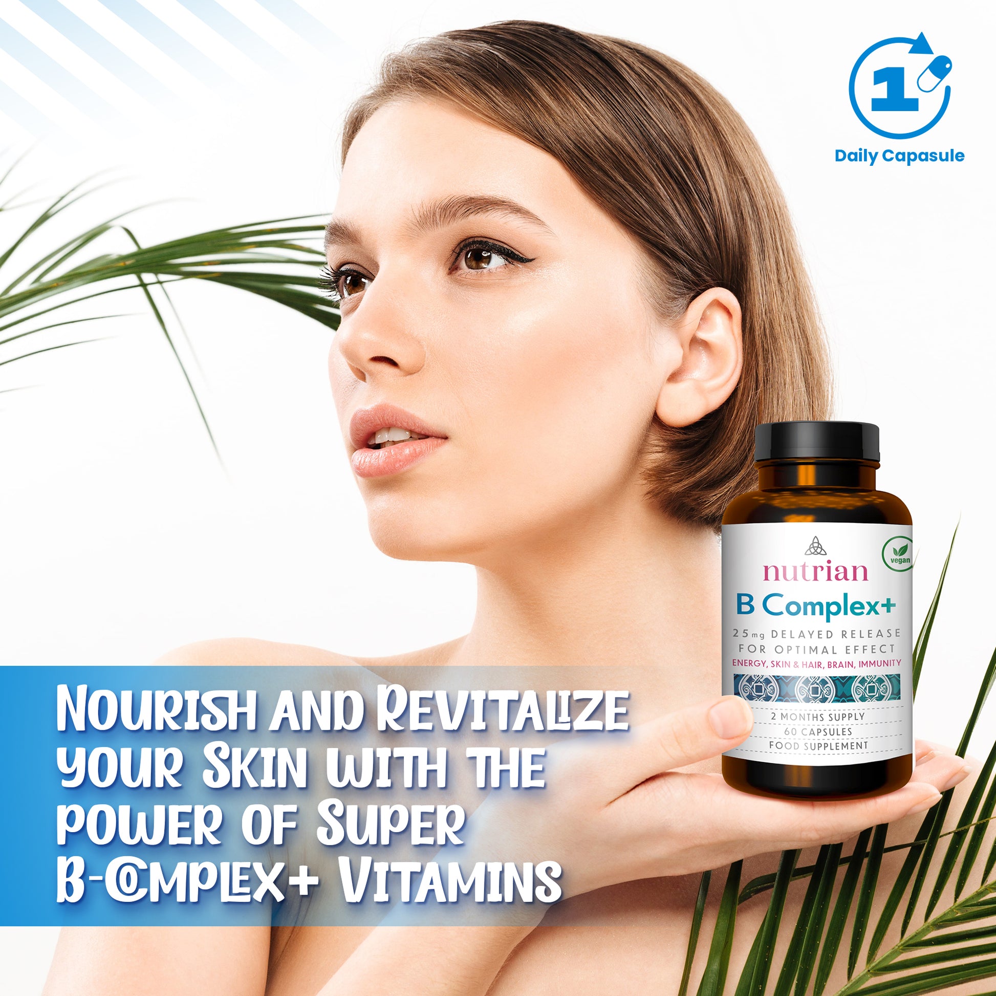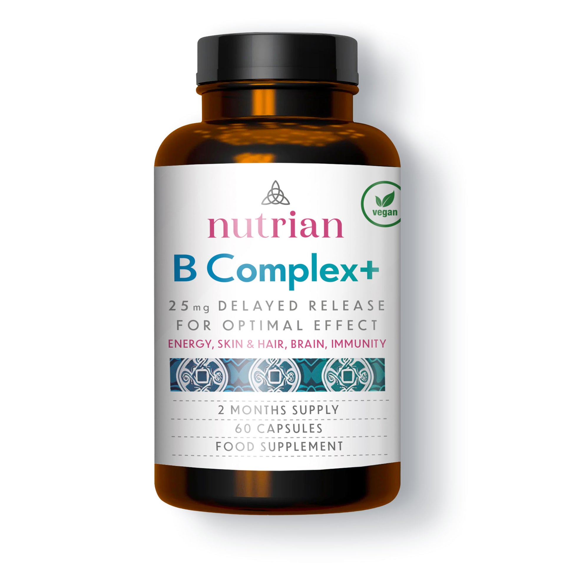 Nutrian Vitamin B Complex+ is a high-strength, vegan-friendly supplement designed to support energy, cognitive function, immune health, and overall well-being. With a full spectrum of essential B vitamins, including high-potency B12, Biotin, and Choline, this delayed-release formula ensures maximum absorption and lasting benefits. Crafted with natural ingredients and manufactured in the UK to the highest standards, it's the perfect choice for those seeking premium quality and effectiveness.